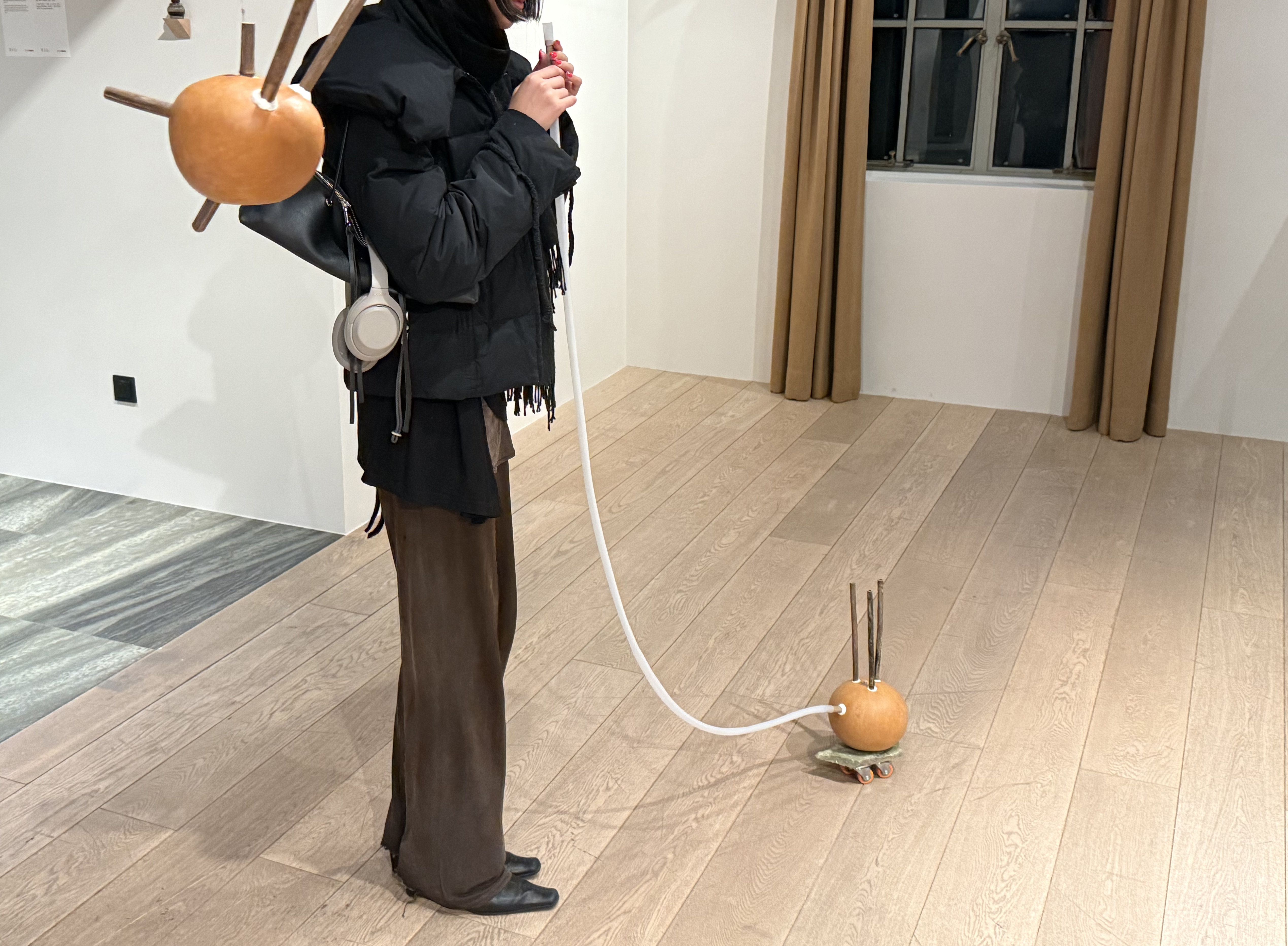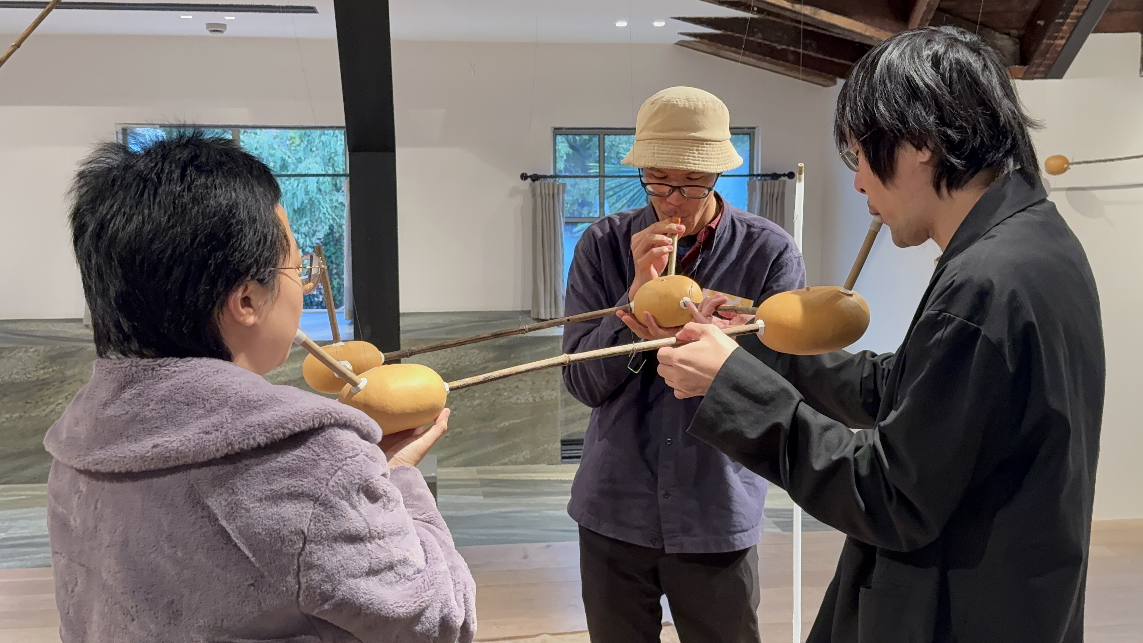 I collected bamboo stalks that had already been used by carpenter bees and turned them into experimental musical instruments. The holes gnawed by the bees—both accidental and inevitable in their placement—now form a natural scale. In other words, these instruments were co-created by the bees and myself. When played, what resonates is the echo of the bamboo’s hollow body and the life cycle of the carpenter bees, responding to seasons, wind, life, and time. The act of blowing into the instrument mirrors the bees’ gestures of gnawing and gathering pollen, bringing to mind the image of a “kiss.”