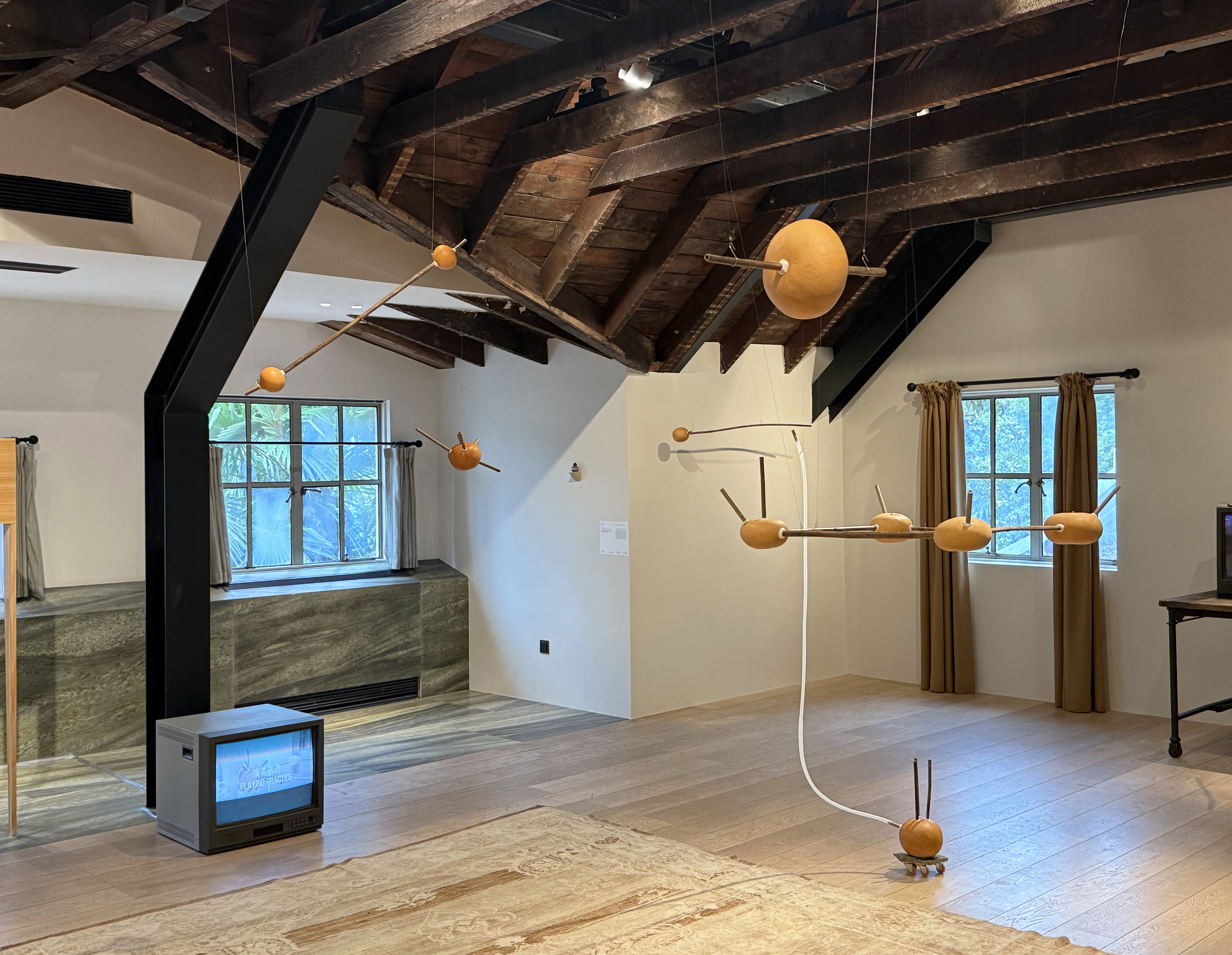 Materials: wood, gourds, brass, flexible tubing, and bamboo bearing perforations made by carpenter bees